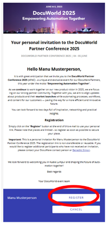 - This is your personal invitation to DocuWorld 2025 (APAC). The registration link cannot be forwarded or used for multiple If you would like to register additional guests who have not received an invitation, please contact benedikt.simon@docuware.com.