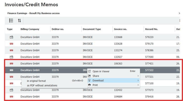 - There is a possibility to download the Invoices/Credit Memos in PDF format