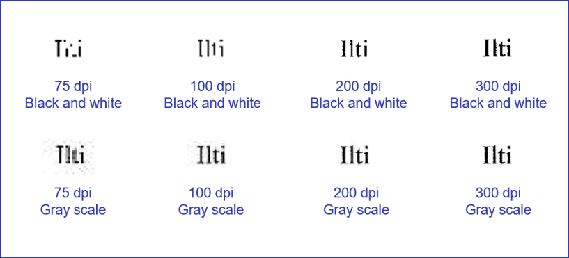 Black and white mode: The character string “Ilti” is only accurately captured at 300 dpi or higher. Grayscale mode: Even at 100 dpi, characters are easily captured, but image information, such as the structure of the paper here is still present. This increases the file, taking up unnecessary storage space. Black and white mode is therefore preferable because it requires less storage at the same dpi setting.