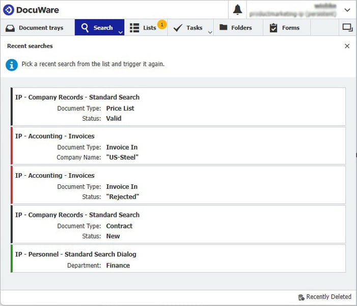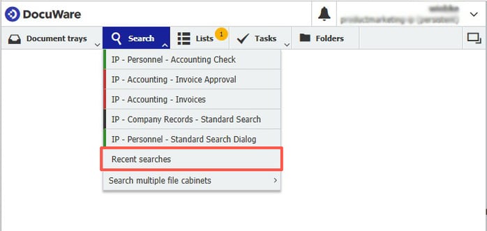 In the search menu, you’ll find not only search dialogs assigned to you, but also the "Recent searches" entry. No matter how many search dialogs you have, this item always appears second to last in the drop-down box.