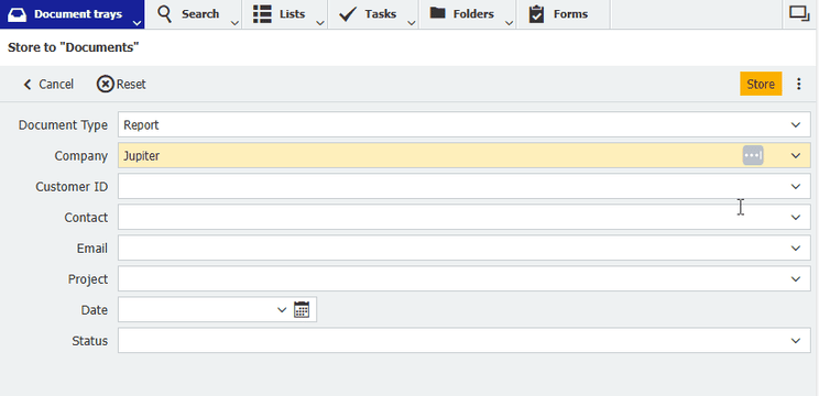 - Select the document in the document tray, click “Store”, and choose an archive.