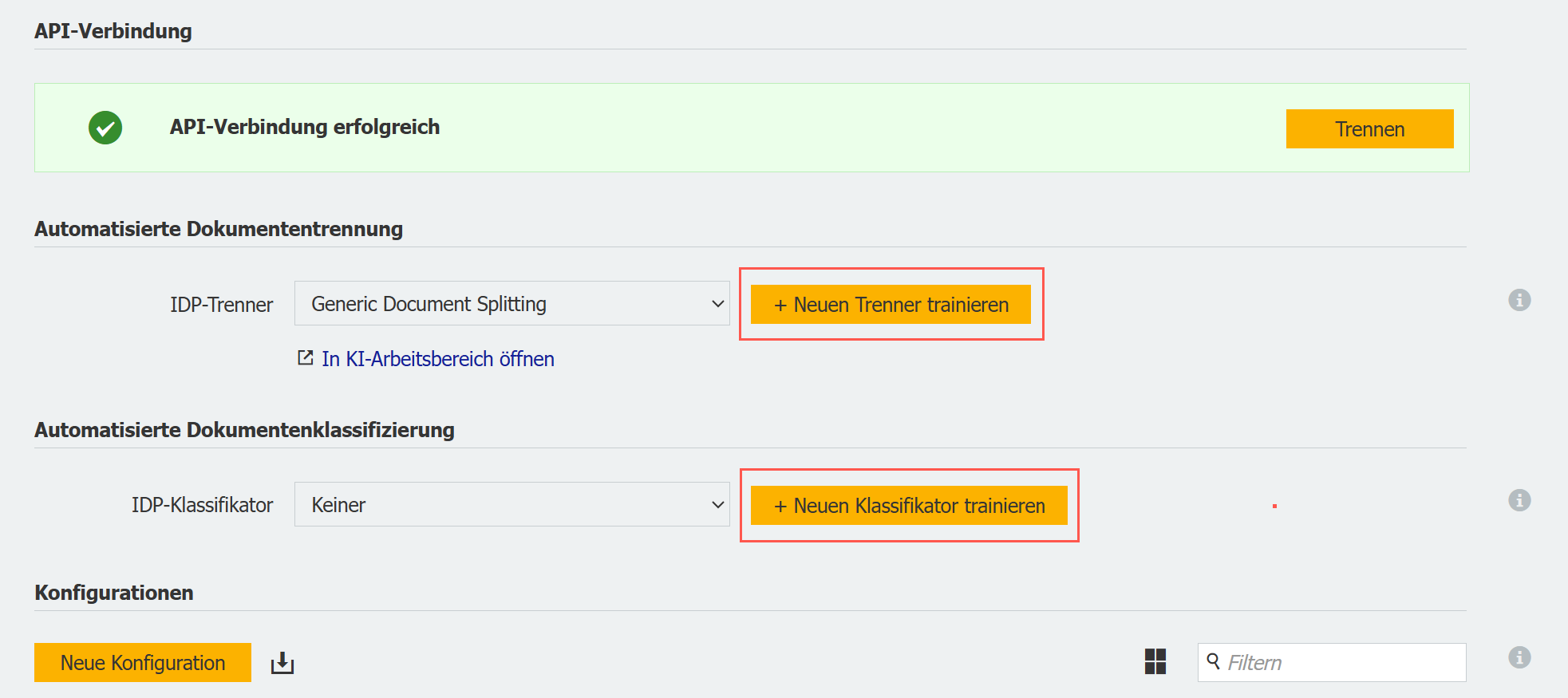 In der DocuWare Konfiguration starten Sie im Bereich IDP das Training von neuen Trennungs- und Klassifizierungsmodellen.