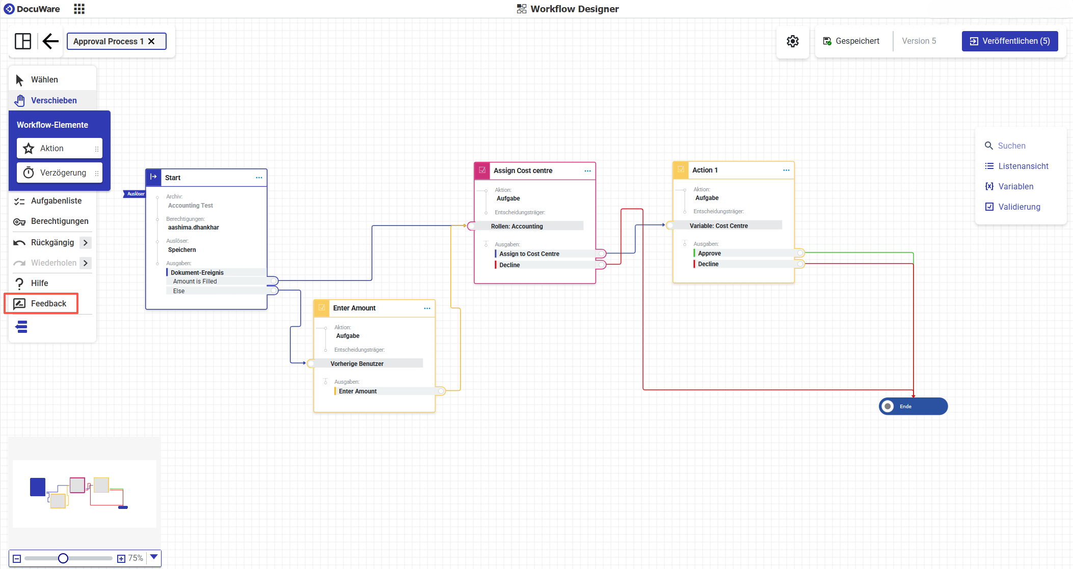 Dies ist die Arbeitsfläche des neuen Workflow Designers, auf der Sie Ihre Prozesse ganz einfach definieren können. Nutzen Sie den Menüpunkt „Feedback“, um uns Ihre Meinung und Vorschläge mitzuteilen.