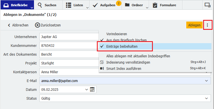 Wenn Sie mehrere Dokumente zu einem Thema oder Projekt auf einmal aus dem Briefkorb ablegen, erspart Ihnen die Funktion „Einträge beibehalten“ manuelle Arbeit und Zeit. Sobald Sie die Funktion aktivieren, werden alle Indexwerte für das nächste Dokument automatisch ausgefüllt und müssen nur noch bei Bedarf angepasst werden.
