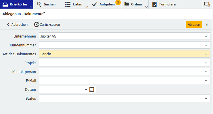 - Markieren Sie alle Dokumente im Briefkorb, die Sie mit einer ähnlichen Indexierung archivieren möchten, klicken Sie auf „Ablegen“ und wählen Sie ein Archiv aus.