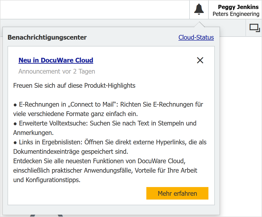 Möchten Sie sofort erfahren, wenn es in DocuWare Cloud neue, praktische Funktionen gibt? Dank dem News-Center bleiben Sie immer auf dem Laufenden und nutzen innovative Features, sobald sie verfügbar sind.
