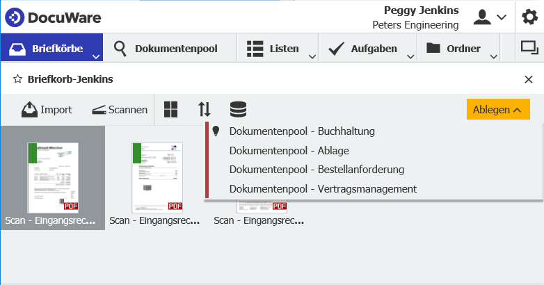 Sobald Sie ein neues Dokument in diesen Briefkorb legen, wird es automatisch im Hintergrund indexiert. Dokumente, bei deren automatischer Indexierung sich Intelligent Indexierung sehr sicher ist, werden grün markiert: