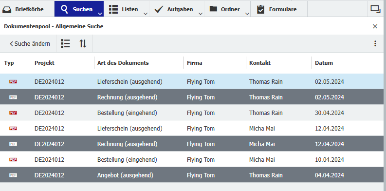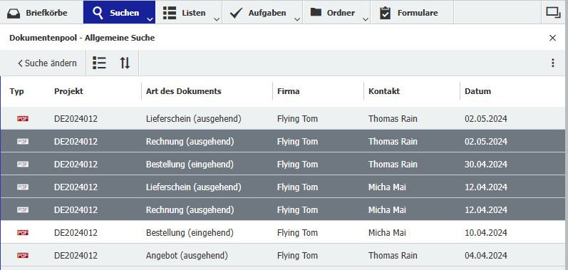 Angenommen, Sie haben in DocuWare eine Suche nach einer Projekt- oder Kundennummer durchgeführt und möchten nun alle oder einzelne Dokumente aus der Ergebnisliste direkt per E-Mail mit Ihrem Kunden teilen. Je nachdem, ob Sie dafür alle oder nur bestimmte Dokumente auswählen möchten, können Sie diese wie in allen Windows-Anwendungen markieren.