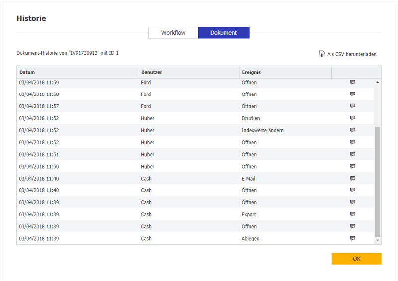 Jeweils mit Datum, Zeit und Benutzer werden beispielsweise folgende Ereignisse protokolliert: Ablage, Indexänderung mit altem und neuem Wert, Anzeige, Druck, Versand per E-Mail, Anfügen von Anmerkungen etc.