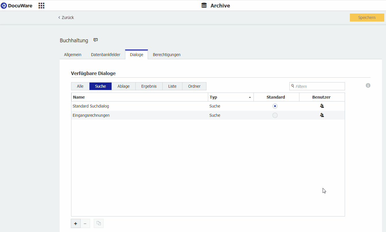 Häufig ist es sinnvoll, mehrere Suchdialoge pro Archiv einzurichten. Der Standardsuchdialog enthält dann z.B. möglichst viele Filtermöglichkeiten. Zusätzliche Suchdialoge können dagegen sehr spezifisch sein, z.B. auf einen Dokumenttyp oder sogar nur auf die Volltextsuche beschränkt. Alles ist möglich und grundsätzlich gilt: Ein neuer Suchdialog wird einfach für jedes Archiv durch einen Klick auf das Plus unter Dialoge im Register „Suche“ angelegt: