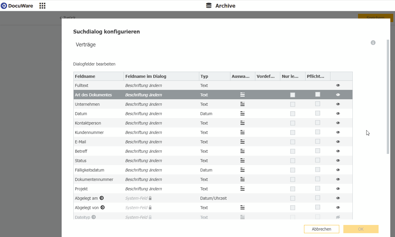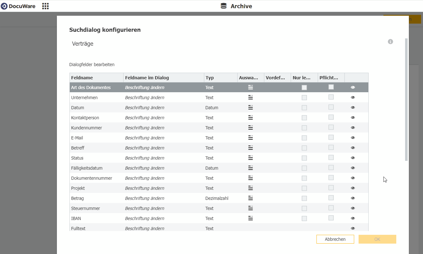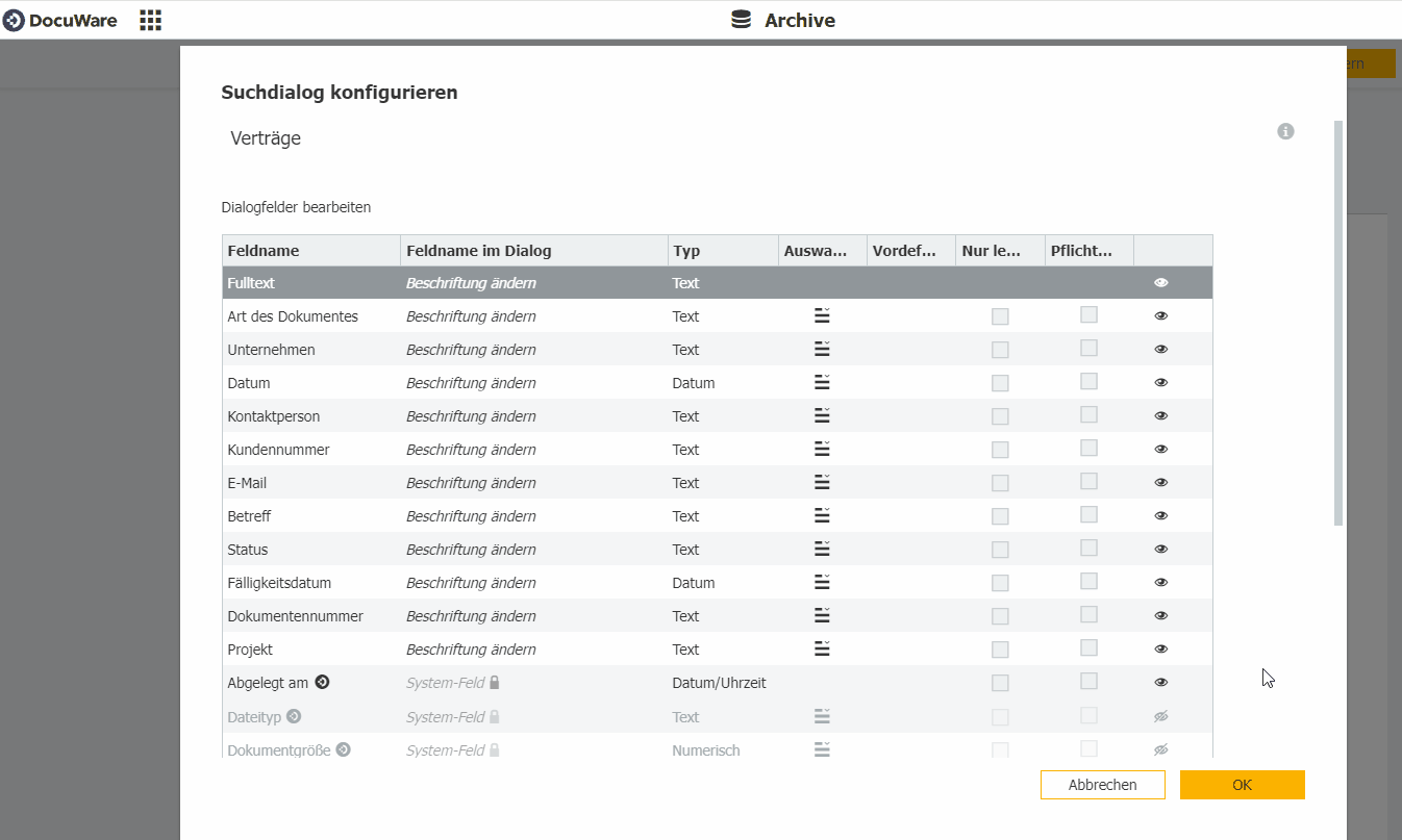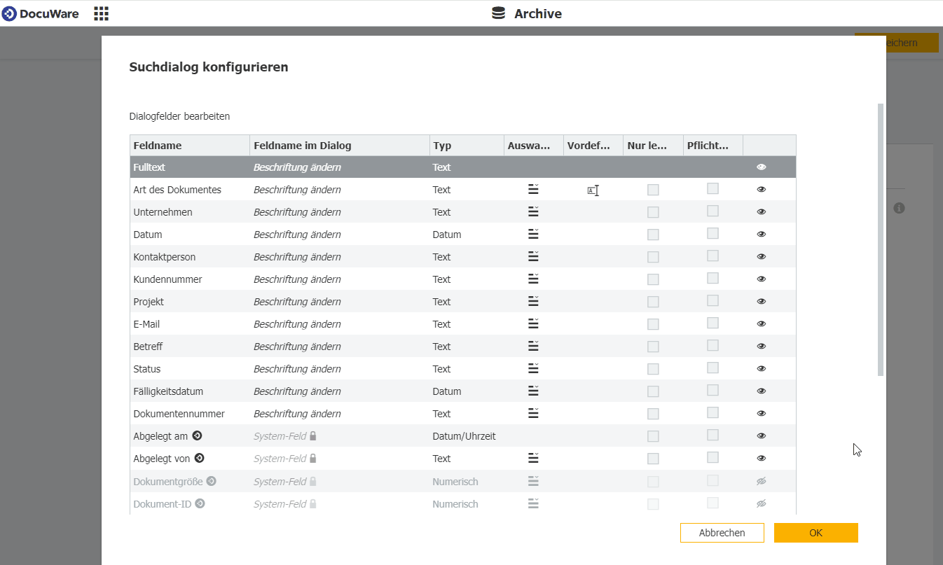 Unabhängig davon, ob es sich um den automatisch generierten Standard-Suchdialog oder einen neu erstellten handelt: Jeder Suchdialog enthält zunächst alle Datenbankfelder, die für das Archiv aktiviert sind. Dies können unter Umständen sehr viele sein, die in der Regel nicht alle für eine gezielte Suche benötigt werden. Um einen Suchdialog zu verschlanken, blenden Sie nicht relevante Felder aus, indem Sie auf das Augensymbol klicken. Außerdem können Sie die Reihenfolge der Felder per Drag & Drop einfach in eine passende Reihenfolge bringen. Platzieren Sie z.B. das Feld für die Volltextsuche ganz oben: