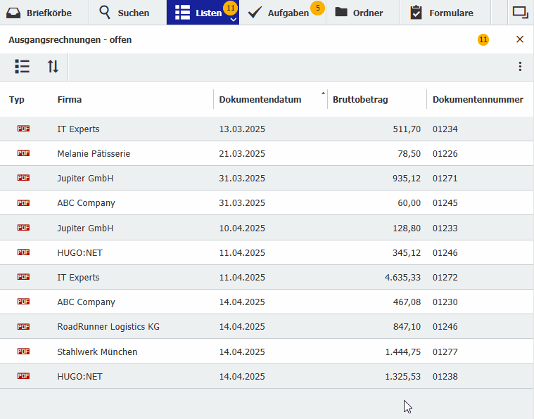 Angenommen, Sie haben eine Liste aller offenen Ausgangsrechnungen vor sich und möchten nur die Rechnungen eines bestimmten Debitors sehen. Anstatt eine neue Suche zu starten, filtern Sie einfach unter „Firma“ nach dem Namen. Bei Bedarf können Sie auch Filter auf mehrere Textfelder setzen und kombinieren.