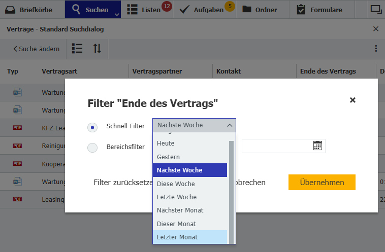 Datumsfilter sind sehr nützlich, um bestimmte Zeiträume weiter einzugrenzen. So lassen sich Fragen wie „Welche Verträge laufen im nächsten Monat aus?“ oder „Welche Rechnungen wurden in der letzten Woche gestellt?“ schnell beantworten. Besonders praktisch: Neben dem individuellen Von-bis-Bereich stehen Ihnen auch vordefinierte Schnellfilter wie „Gestern“, „Nächste Woche“ oder „Letzter Monat“ zur Verfügung.
