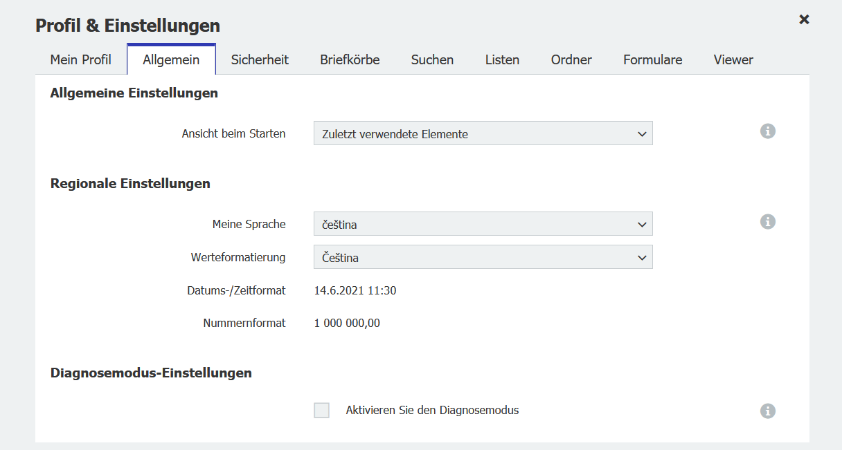Ihre Sprache sowie Zahlen- und Datumsformat stellen Sie im DocuWare Client unter Profil & Einstellungen im Tab Allgemein ein: