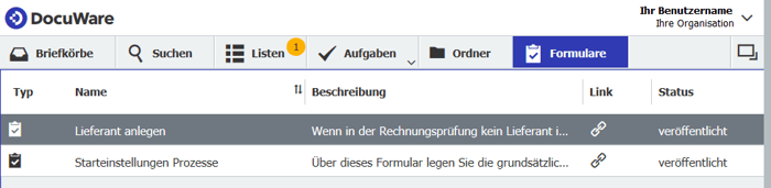 - Auch in der DocuWare Konfiguration können Sie direkt auf das Fomular zugreifen: > Konfigurationen > Formulare > Lieferant anlegen